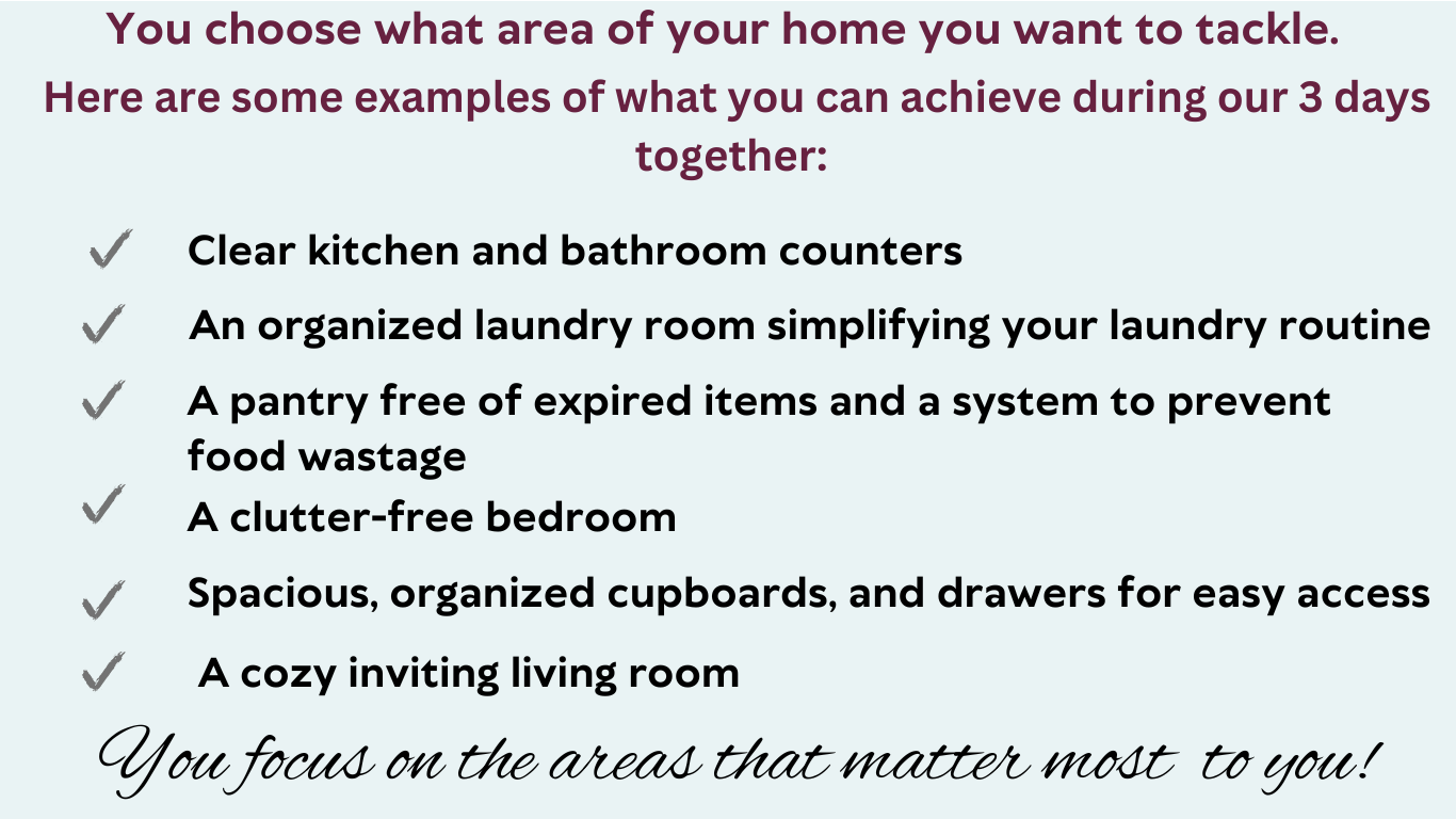 By the end of this 3 day training you will have 3 areas of your home organized!